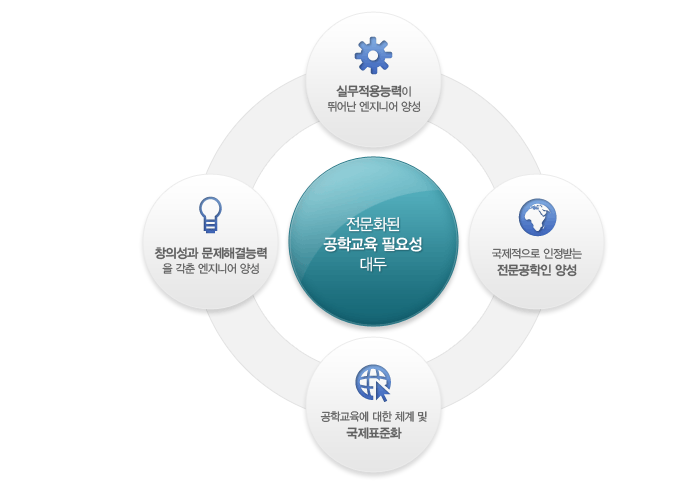 공학교육인증은 공과대학의 교육 프로그램 수립과 개선을 위해 협조하고, 공학 및 공학 관련 직업을 추구하는 사람들의 능력개발을 도움으로서, 공학교육 전반에 걸쳐서 내실있는 발전을 이루고, 장차 지식산업 사회에서 주도적인 기여를 할 실력있고 창의력 있는 공학인을 배출하고자 함.