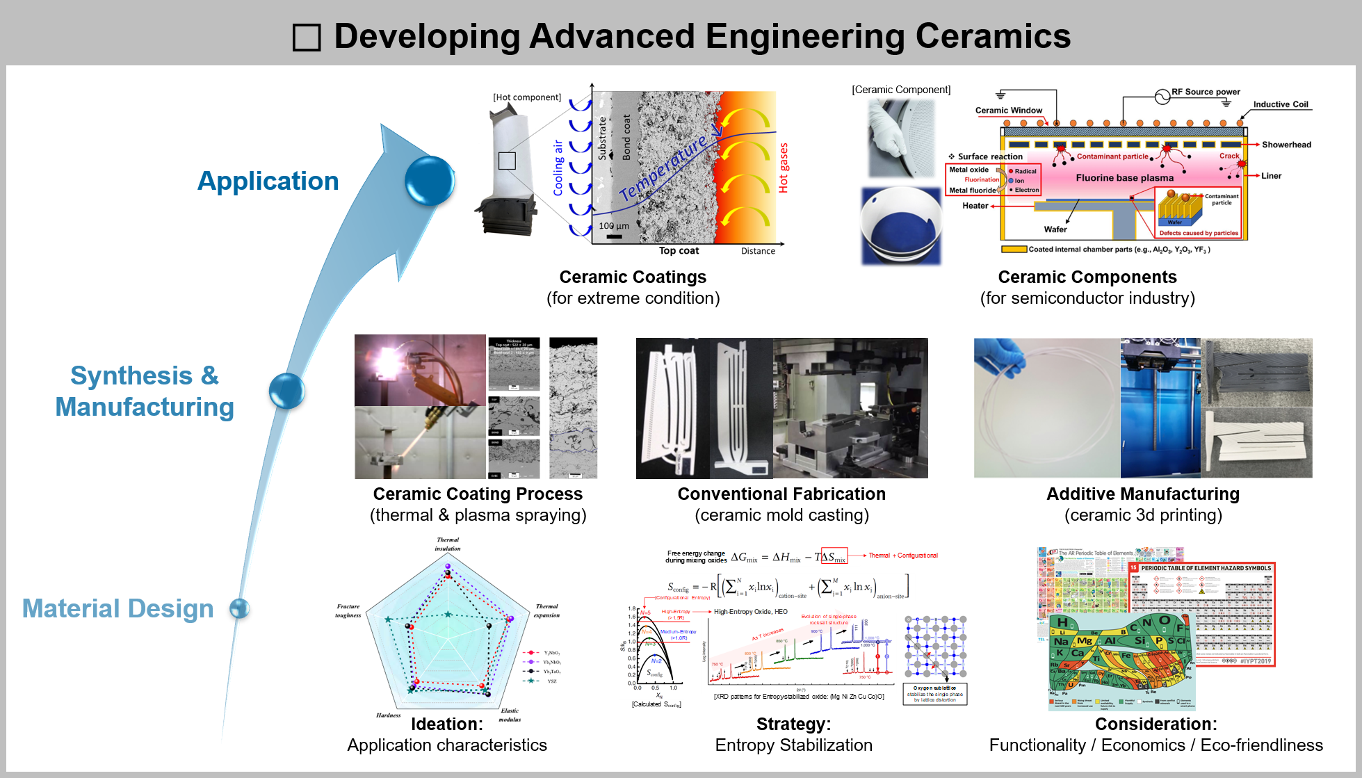 엔지니어링 세라믹스는 우수한 기계적 특성과 고온, 화학적 안정성을 바탕으로 국가 산업 분야 전반에 널리 적용되는 소재입니다. 저희 연구팀에서는 고엔트로피 전략을 기반으로 한 발전/항공 및 반도체 용 새로운 세라믹 소재와 코팅 개발을 통해 지속 가능한 에너지와 첨단 산업 발전의 도전 과제를 해결하고자 합니다.